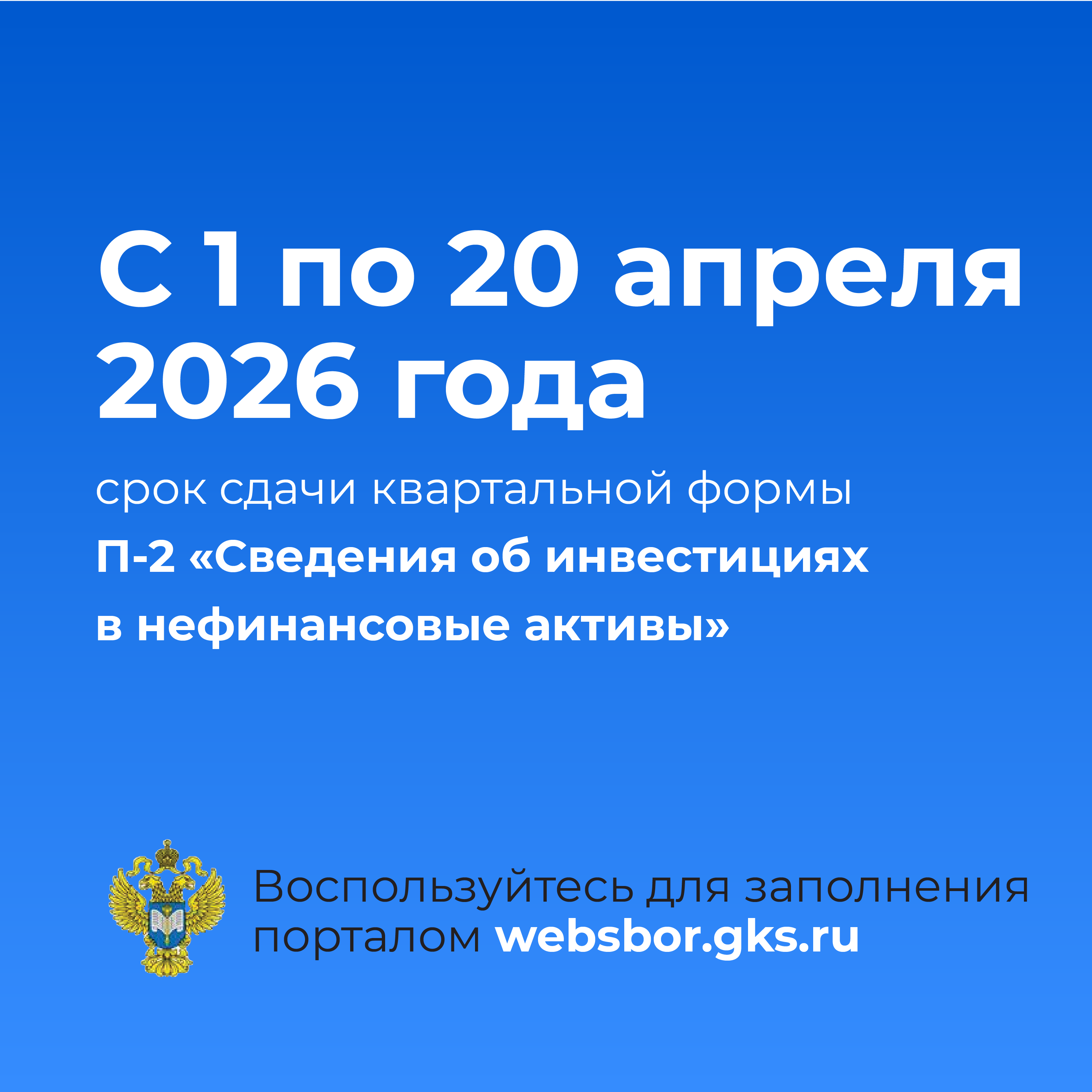 С 1 по 20 апреля 2026 года необходимо направить первичные статистические данные по квартальной форме федерального статистического наблюдения № П-2 «Сведения об инвестициях в нефинансовые активы».