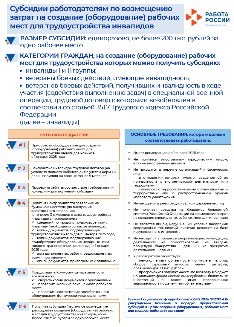 - на создание (оборудование) рабочих мест для трудоустройства инвалидов I и II группы, ветеранов боевых действий и ветеранов, получивших инвалидность в ходе участия в СВО.