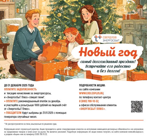 С 1 ноября по 31 декабря 2025 года оплатите задолженность и текущие начисления за энергоресурсы, внесите рекомендованный платёж за декабрь и станьте претендентом на получение призов, а «ЭнергосбыТ Плюс» спишет пени*! Подробная информация об условиях акции: